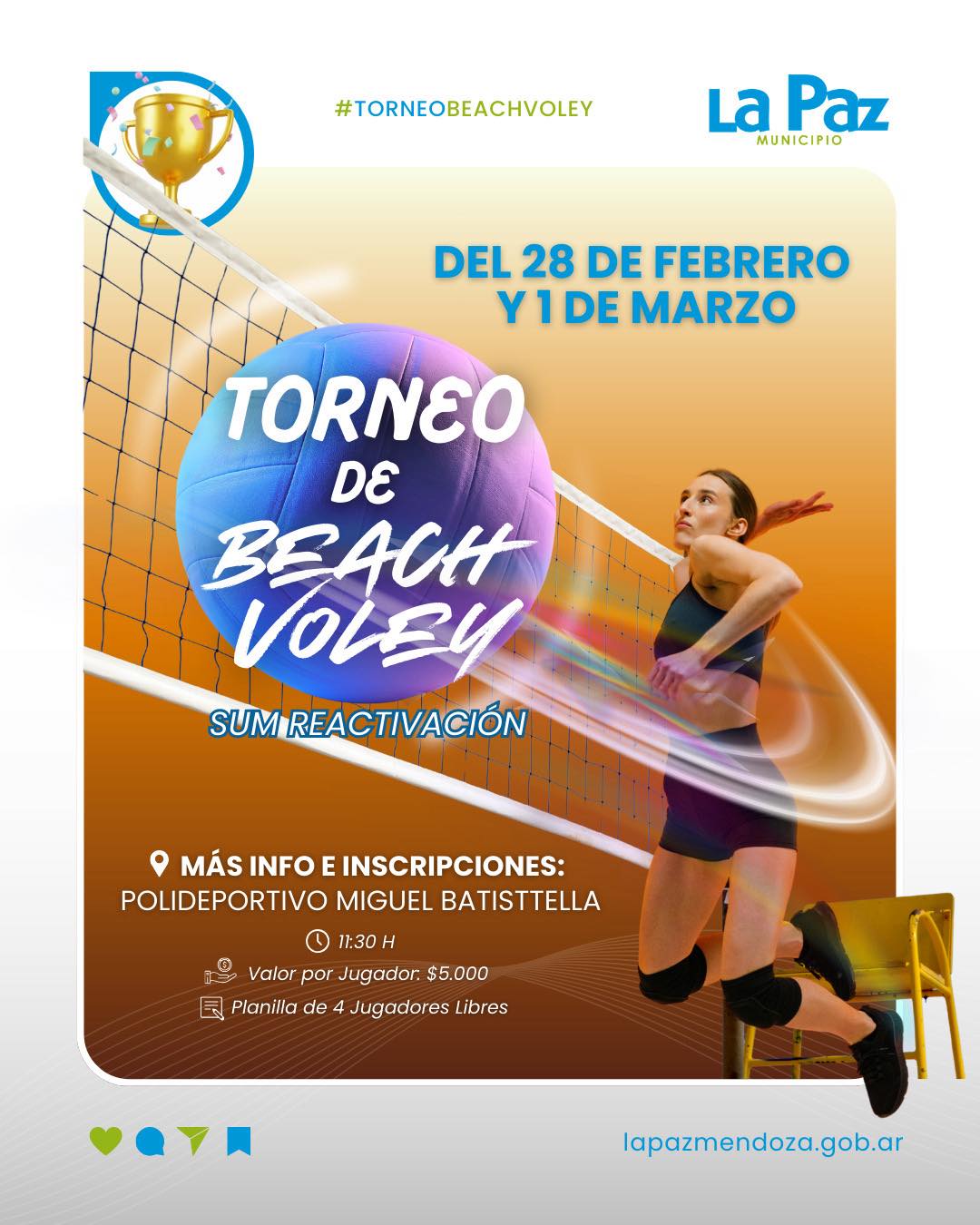 El Municipio invita a participar del Torneo de Beach Vóley que se disputará los días 28 de febrero y 1 de marzo en el SUM del Barrio Reactivación, una propuesta deportiva para disfrutar del verano a puro juego y competencia.