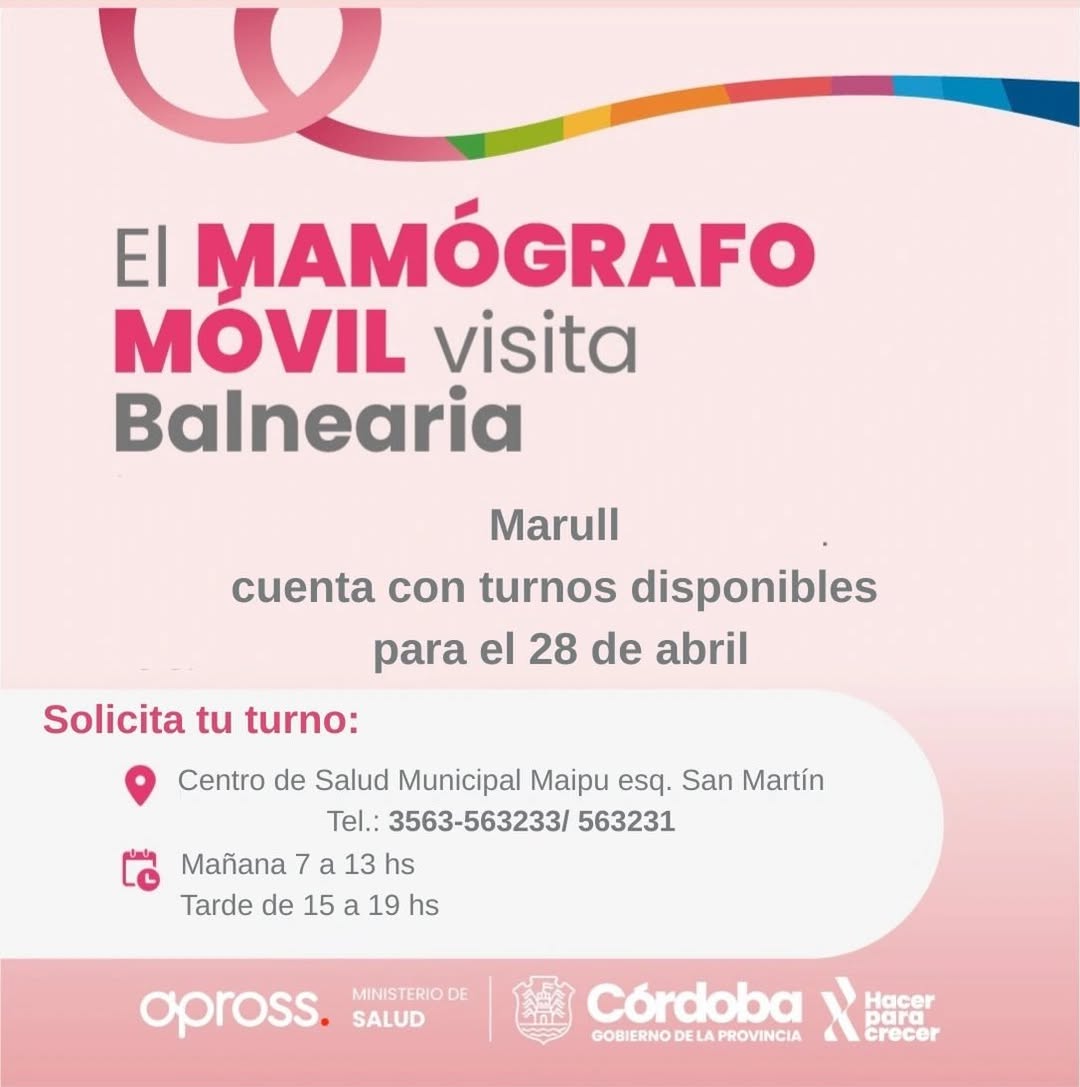 Marull (LM).- El mamógrafo movil visita Balnearia, y el próximo 28 de abril, Marull contará con turnos disponibles para realizarse mamografías, una herramienta clave para la detección temprana del cáncer de mama.