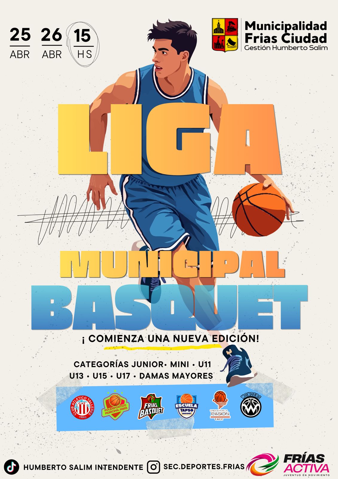 Frías (LM).- Organizada por la Municipalidad de Frías, en el marco del permanente apoyo al deporte local que impulsa la gestión del intendente Néstor Humberto Salim, dará inicio el próximo sábado la Liga Municipal de Básquet 2026, coordinada por la Subsecretaría de Deportes de la comuna friense. La nueva edición presenta importantes novedades destacándose la incorporación de las Escuelas Formativas del Polideportivo Municipal en las categorías Mini, U11 y U13, cumpliendo así el anhelo de que niños y niñas que asisten a la Escuela de Básquet, que funciona los martes y jueves en dicho espacio participen del torneo. Otra novedad es la incorporación de la Categoría Femenina +30. El torneo iniciará el sábado desde las 9:30 hs, con los más pequeños (Junior y Mini) en el Polideportivo de Frías, por la tarde, a partir de las 14:30 hs, la actividad continuará en el Polideportivo de Tapso. En tanto, la jornada del domingo se disputará en la sede del Club Talleres, desde las 15:00 hs.